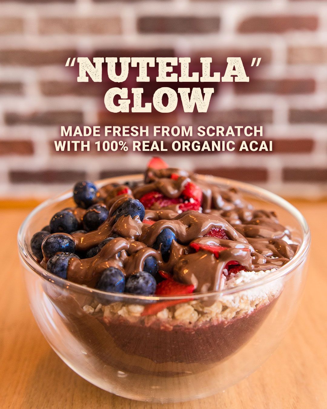 Chocolate lovers, this one’s for you—but with a healthy twist you can feel good about. The Nutella Glow starts with our organic acai house-made base, which is blended fresh daily. We use cocoa and maple as natural sweeteners instead of processed sugar or artificial flavors. And here's the kicker: our “Nutella” is made without any seed oils, unlike our competitors' version. Add in collagen, hyaluronic acid, and vitamin C, and this bowl becomes a truly guilt-free pleasure that nourishes your skin while satisfying your sweet tooth.